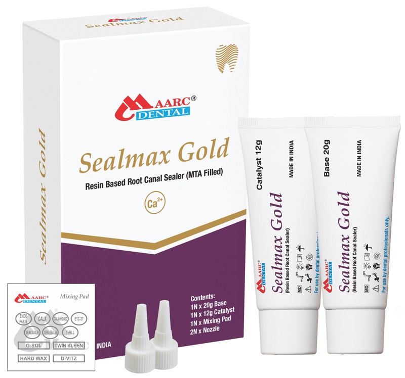 Description: Sealmax Gold is an MTA filled, resin-based root canal sealing material supplied in the form of paste. The base paste and catalyst paste are mixed to produce a root canal sealing material of excellent sealing capacity and tissue compatibility. As a result of its close adaptation to the walls and hydrophobic nature, Sealmax Gold allows tight sealing of root canal during obturation.