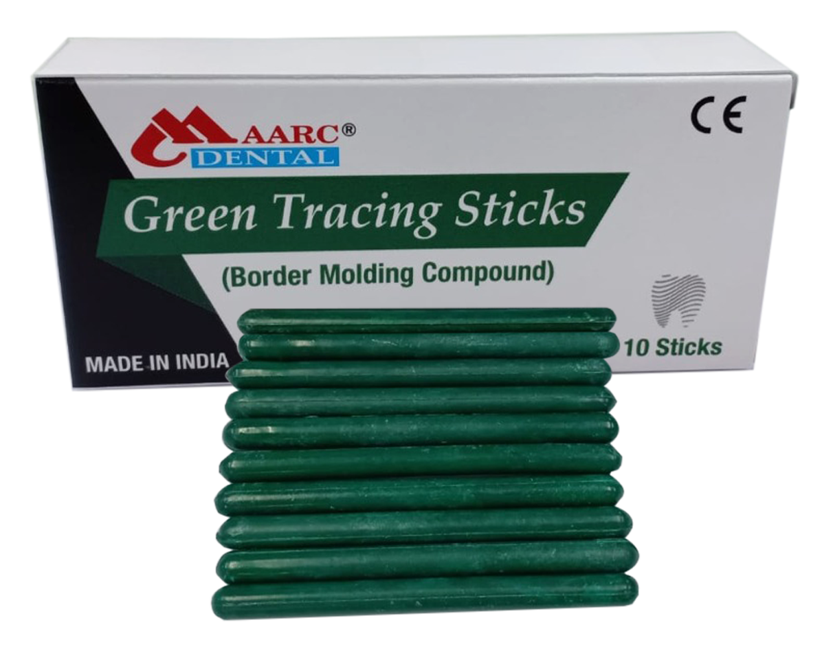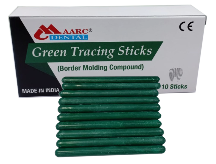 Description: Green tracing sticks is a thermoplastic material supplied in the form of sticks (type-1 low fusing impression compound). It is a low fusing material primarily used for border extensions on custom impression trays as it attains uniform plasticity. Attains high viscosity at comfortable temperatures 55-65°C making it ideal for recording the full depth of the sulcus, recording of the borders during impression making for preparation of removable dental prosthesis, taking functional and relining impressions. Provides wide working area due to extra working time & quick hardening property when immersed in cold water